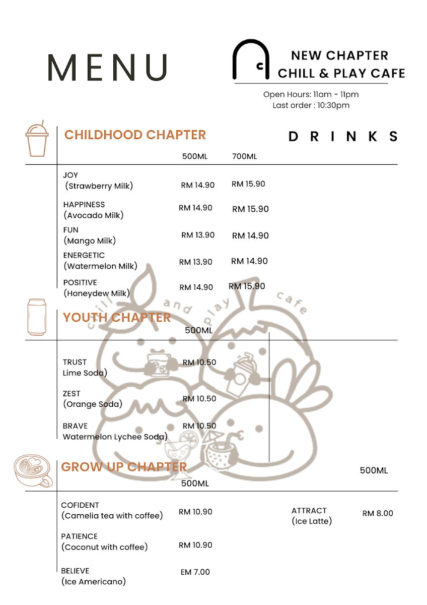 NEW CHAPTER CHILL & PLAY CAFE Menu